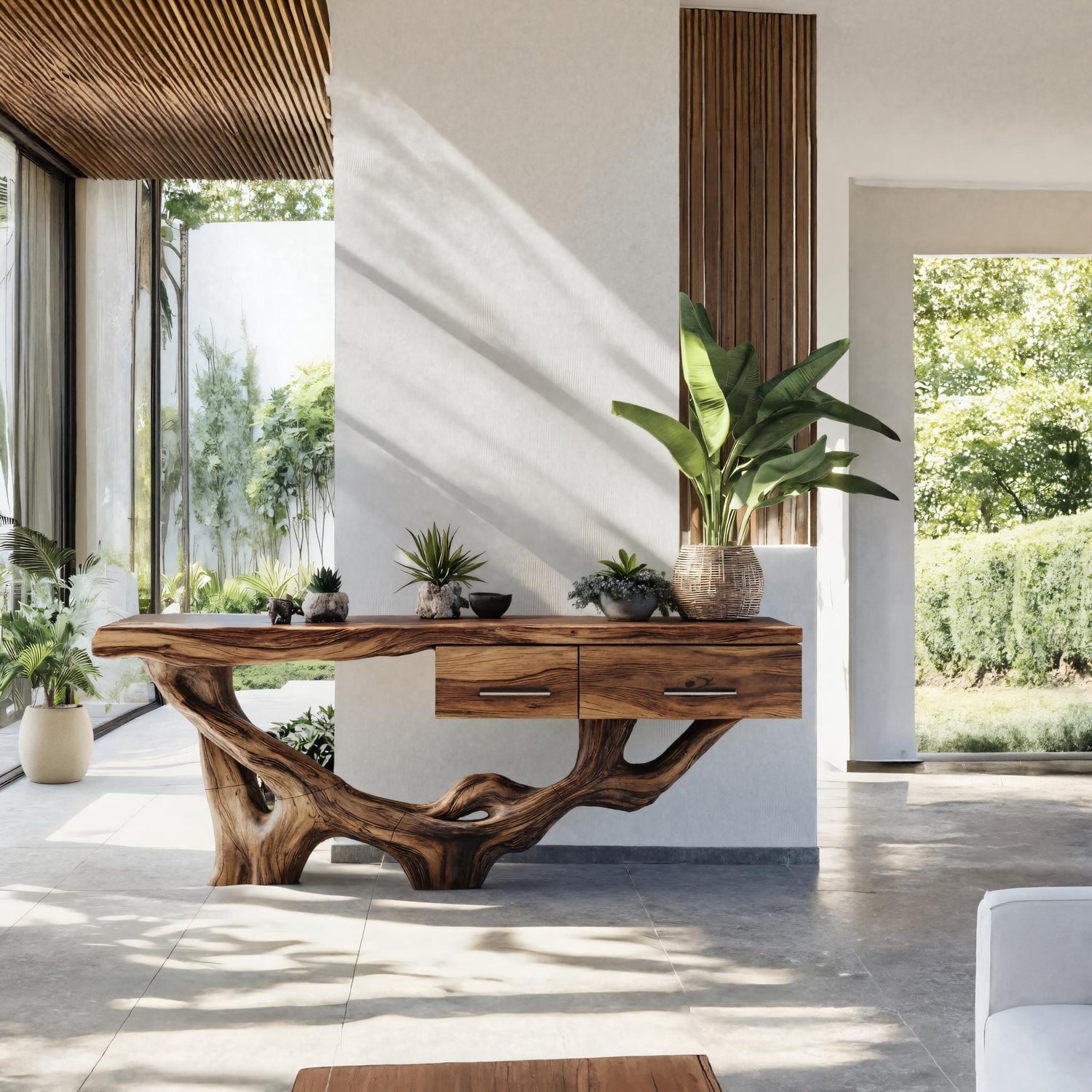 Each console table is unique, showcasing the natural beauty of solid wood through its organic grain, textures, and subtle imperfections. Every edge retains the lively character of the wood, ensuring no two pieces are ever the same. Finished with care, the surface highlights the wood’s depth and warmth—creating a centerpiece that combines practicality with understated sophistication.