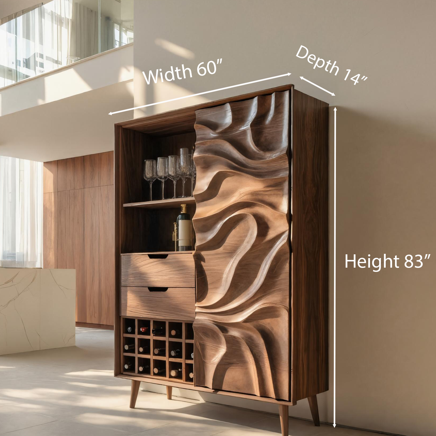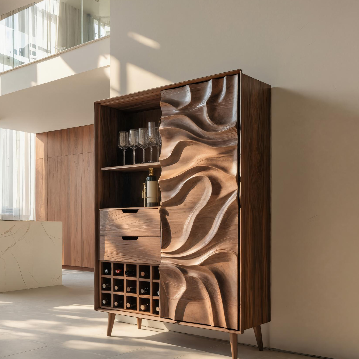 This bar cabinet features fluid, wave-carved doors that bring a sense of movement and sophistication to the room. The textured surface catches light beautifully, emphasizing the natural patterns of the wood. Behind the sculpted doors lies thoughtful storage space for bottles, glassware, and essentials — perfectly balancing visual artistry with everyday practicality.