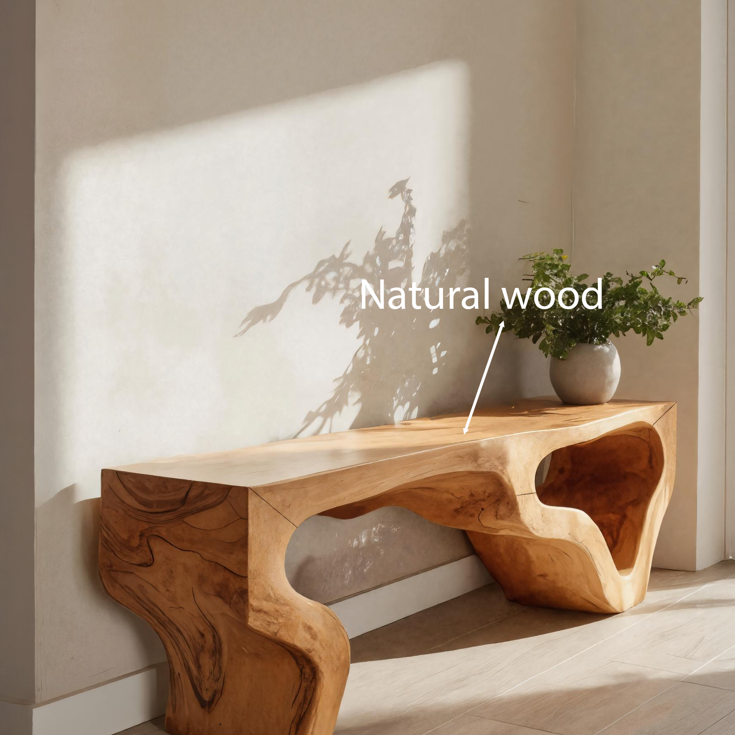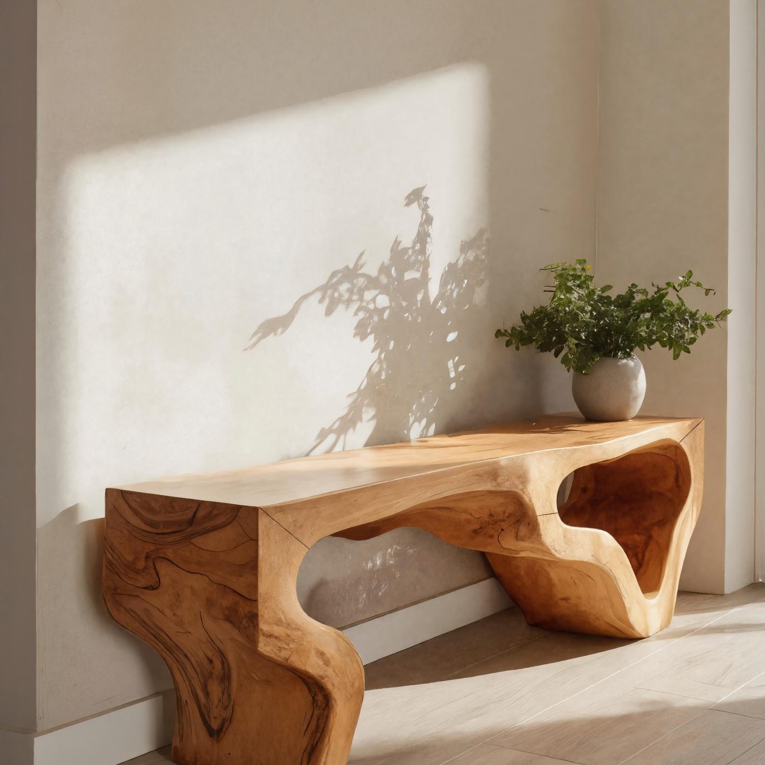 This bench features a bold carved base with smooth, curving lines that highlight the organic character of solid wood. Its dynamic form balances stability and sculptural expression, making it equally suitable as seating, display, or a decorative focal point in modern interiors.