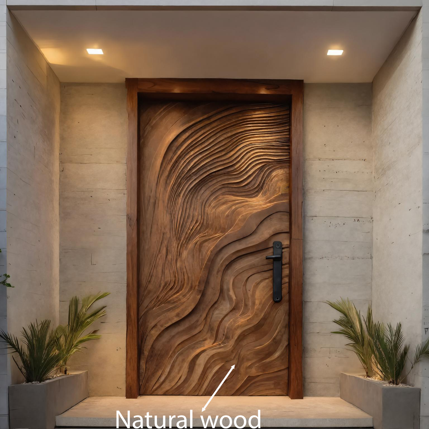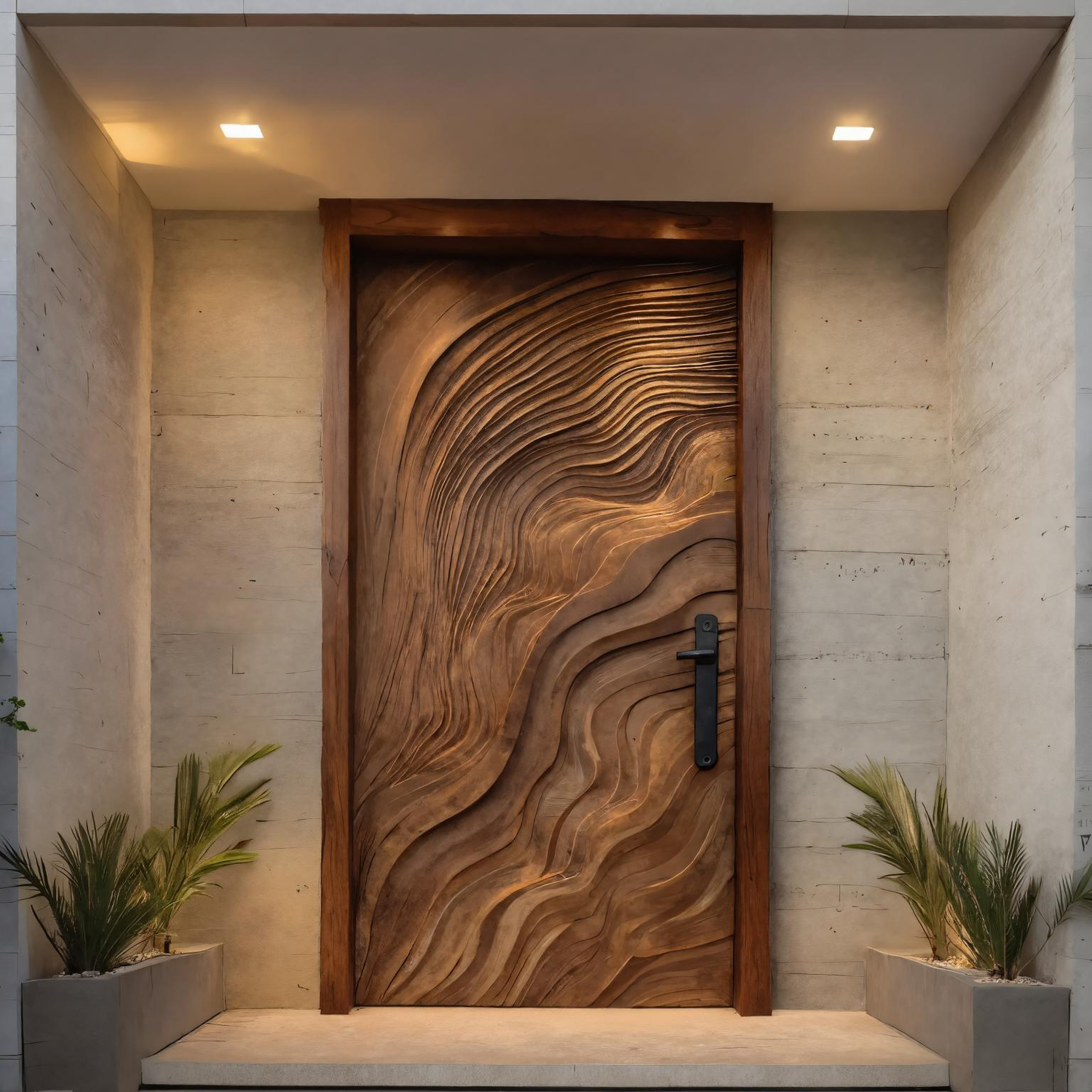 This front door features a sculpted 3D wave pattern that captures light and shadow, adding visual texture and warmth to the entrance. The organic curves contrast beautifully with the clean rectangular frame, giving the piece both structure and fluidity. Ideal for modern homes, villas, or creative studios seeking a distinctive focal point.