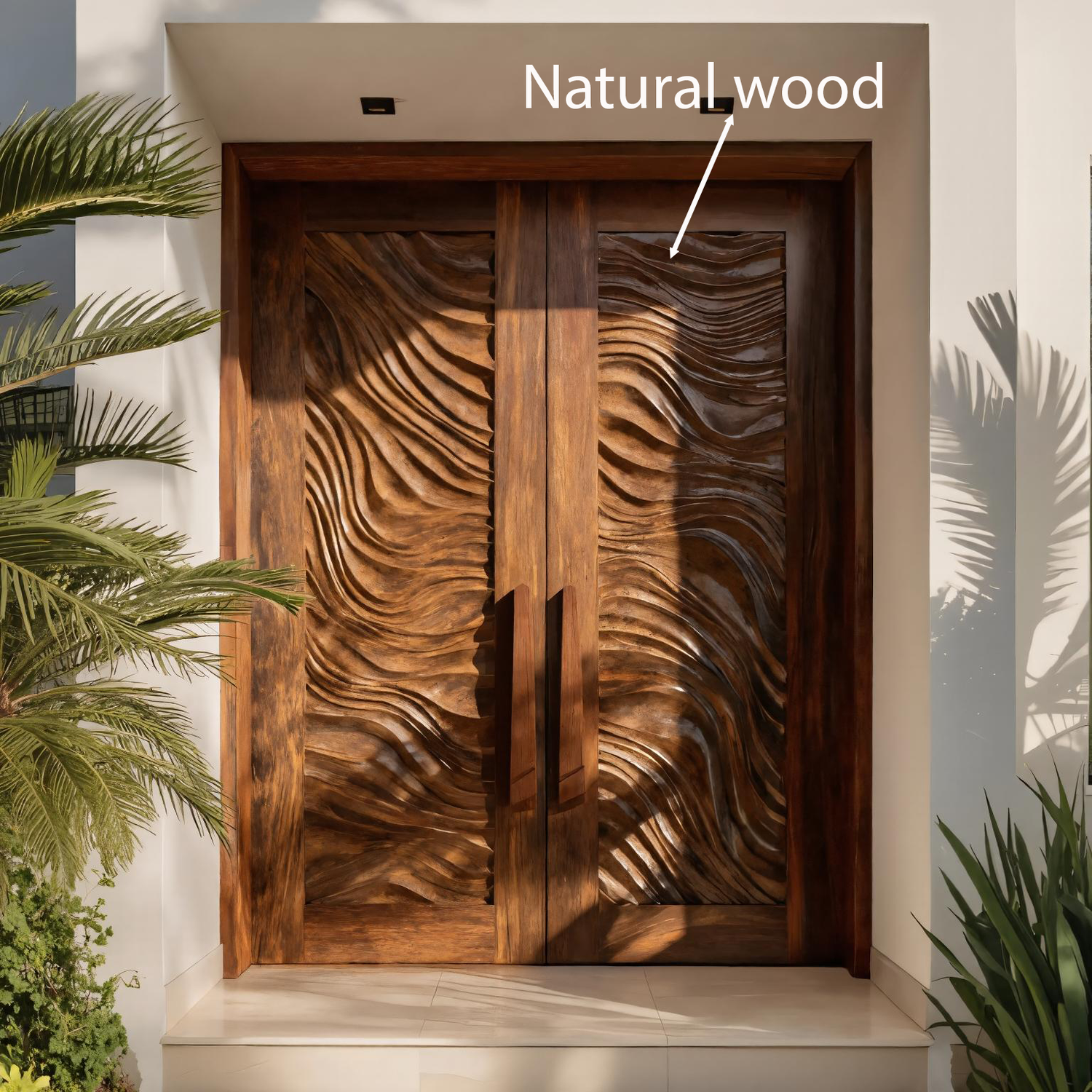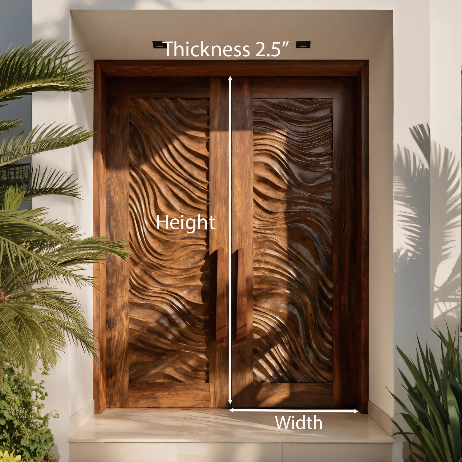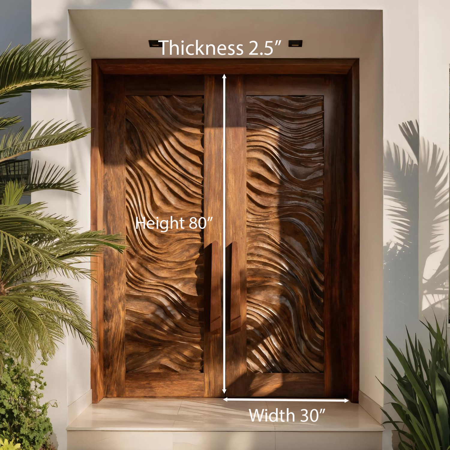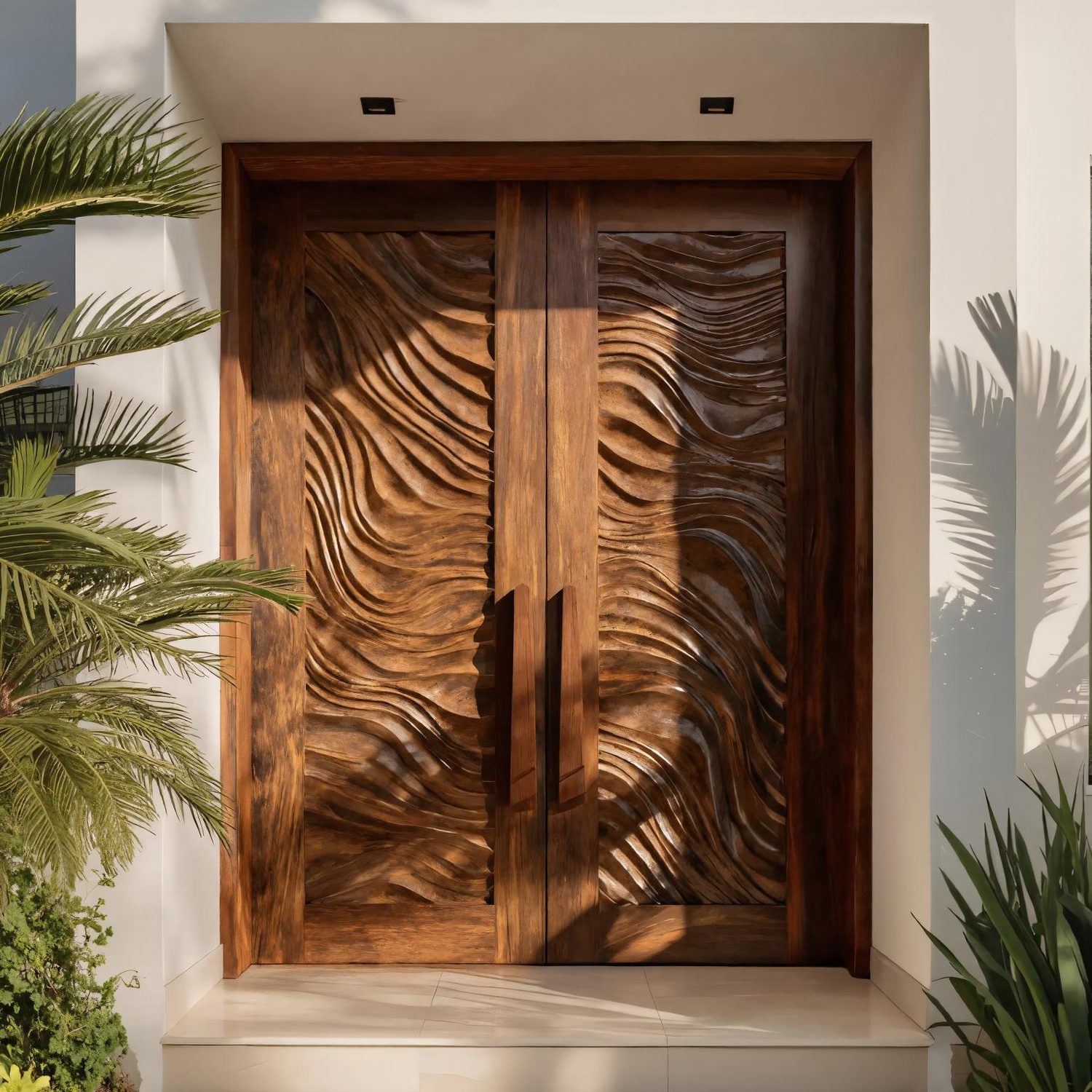 This double front door showcases a sculptural wave motif that highlights the natural contours of the wood. The layered carving creates depth and dimension, allowing light to reveal subtle variations across the surface. Balanced proportions and clean framing enhance its contemporary character, making it ideal for modern homes that value organic design and visual impact.