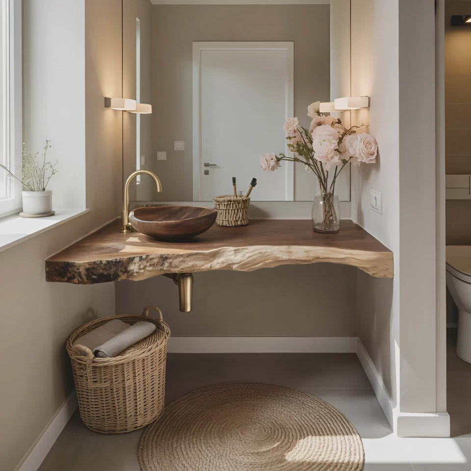 The live edge finish highlights the natural grain and character of the wood, creating a rustic yet elegant look. Each piece is designed to stand out as a unique focal point.