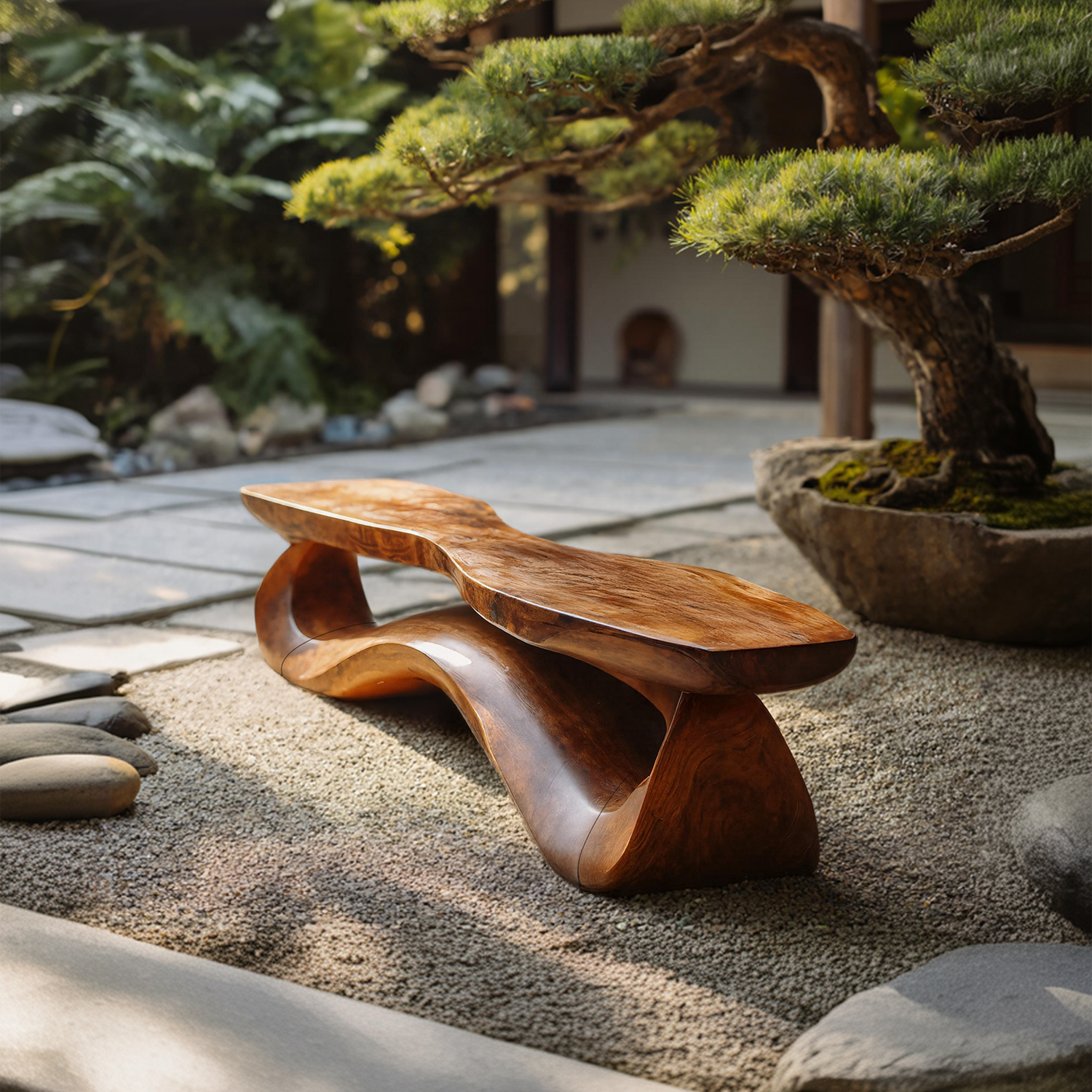 Each bench reveals the authentic character of real wood, with natural grain movement, knots, and edge variations shaped by the original tree. The live-edge detailing preserves the raw outline of the wood, giving the bench a sculptural and expressive presence while remaining harmonious in everyday interiors. Because of this natural variation, every piece carries its own visual identity and subtle uniqueness.