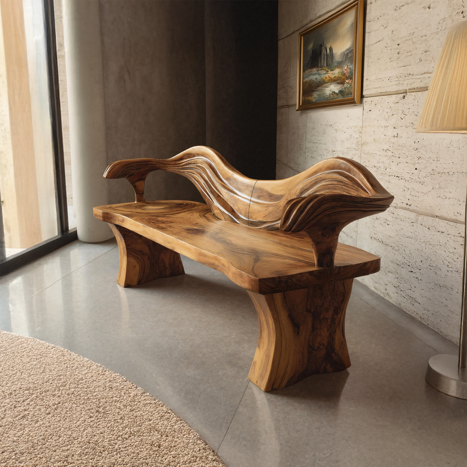 Each bench reveals the authentic character of real wood, with natural grain movement, knots, and edge variations shaped by the original tree. The live-edge detailing preserves the raw outline of the wood, giving the bench a sculptural and expressive presence while remaining harmonious in everyday interiors. Because of this natural variation, every piece carries its own visual identity and subtle uniqueness.
