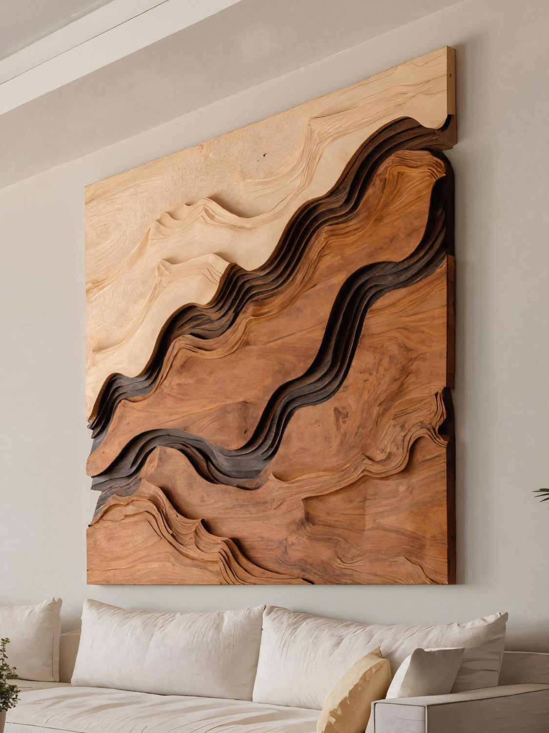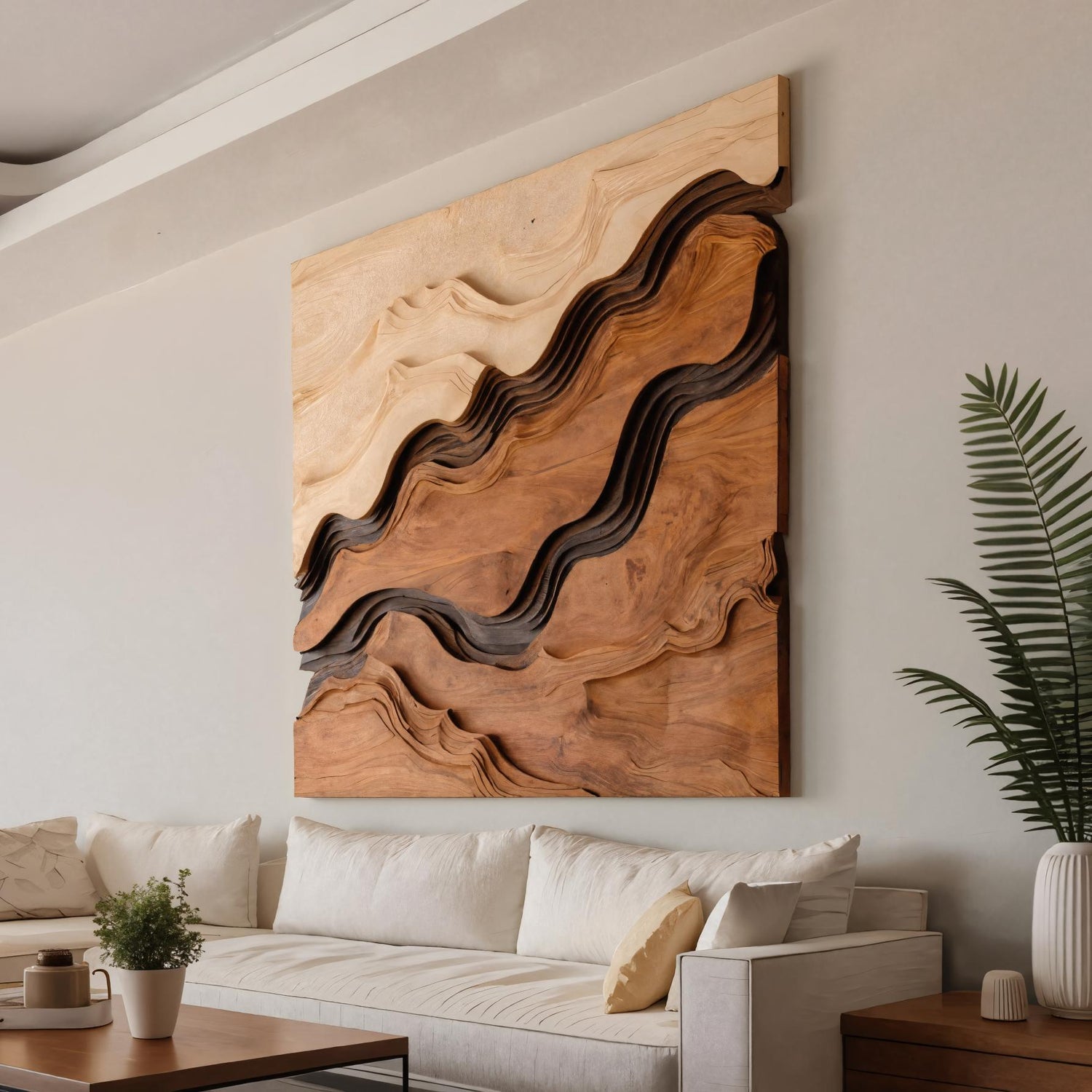 This wall art features a square composition defined by undulating wave layers that create a sense of organic motion. Each carved contour reveals the interplay between light and shadow, highlighting the intricate grain and tonal variation of solid wood. Designed with clean edges and sculptural precision, it adds both texture and sophistication to any contemporary interior.
