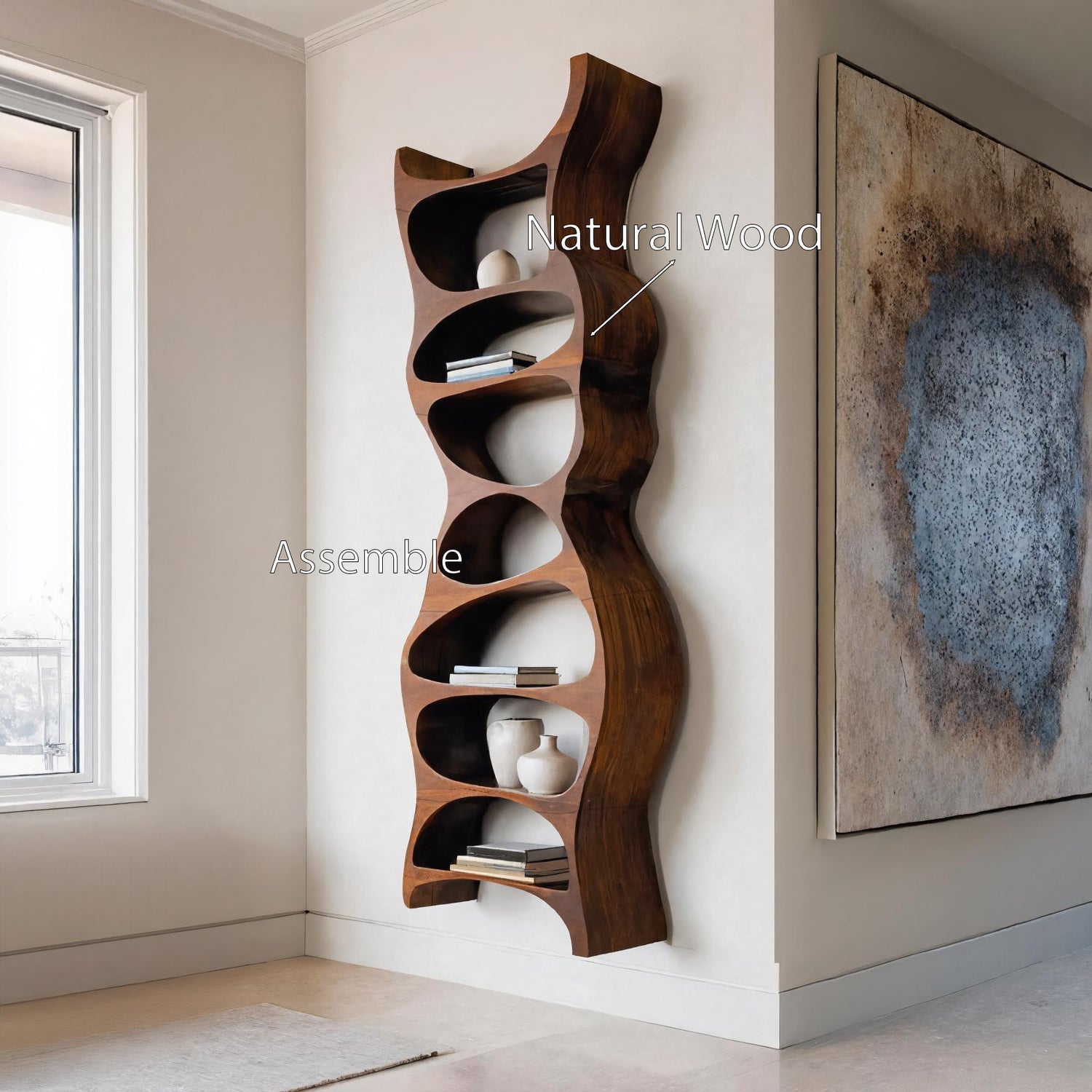 Celebrate the union of modern artistry and functional storage with our Tall Sculptural Wall Mounted Bookshelf For Living Room, designed to bring flowing form and striking presence into your interior. This piece introduces warmth, simplicity, and timeless elegance, turning a practical necessity into an artistic feature.